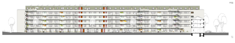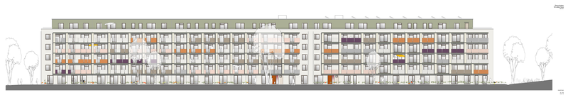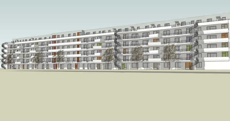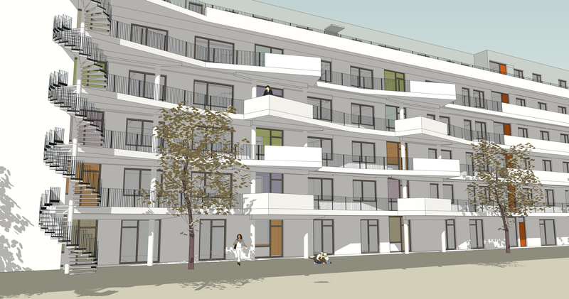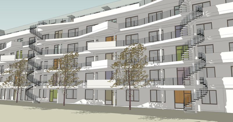 Auf den einzelnen Stockwerken werden die Wohnungen über Laubengänge erreicht. Diese sind aber weit mehr als reine Erschließungsgänge: Sie erhielten Aufweitungen, die als gemeinschaftliche Balkone genutzt werden können.